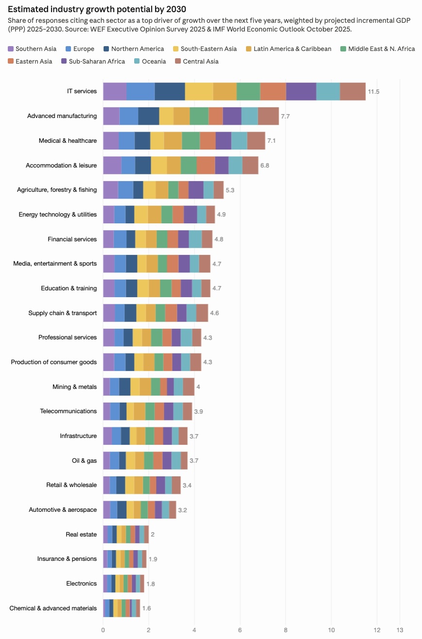 Not all sectors are equally positioned to benefit from the structural shifts reshaping the global economy. Based on IMF GDP projections combined with responses from over 11,000 business executives surveyed by the World Economic Forum, a clear picture of growth potential emerges across industries through 2030.